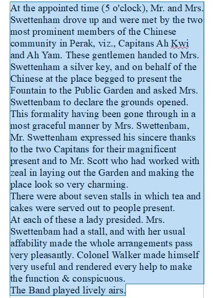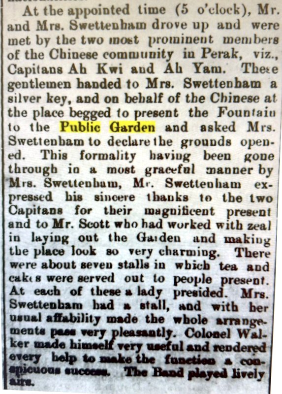 It was an eyeopener for me that there has been a fountain in the Taiping Lake Gardens from the beginning. Presented by the Chinese community, see my blog, Taiping Lake Gardens. I searched the NewspaperSG archive and found another report about the opening of the Lake Gardens.