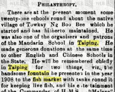 The Taiping people will remember him because of the handsome fountain he donated in 1908 to the fish market of Taiping. Not only decorative, but also functional because there were tanks around the fountain to keep the fish alive.