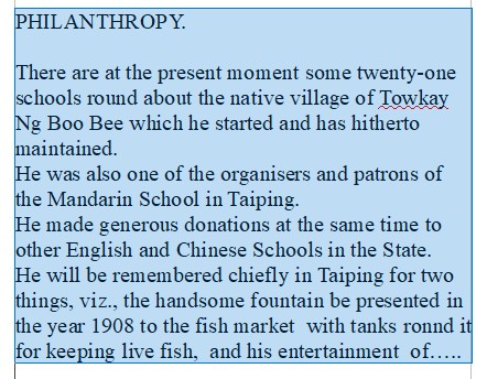 Ng Boo Bee was not only an important tycoon and a millionaire, but also a philanthropist . Here is a part of the obituary, published in the Pinang Gazette and Straits Chronicle