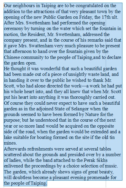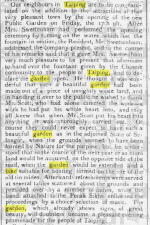 A humorous detail: Swettenham compares the two public gardens in Taiping and Kuala Lumpur. He can do that because, before becoming the Resident of Perak (1889-1896), he was the Resident of Selangor (1882-1889). This is his opinion about the Taiping Lake Gardens: