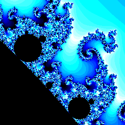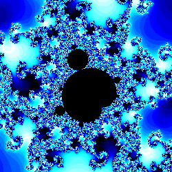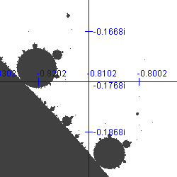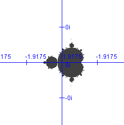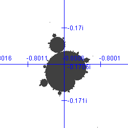 Bedenk dat in de omgeving van dit Mandelbrotje opnieuw oneindig veel nog kleinere Mandelbrotjes voorkomen.