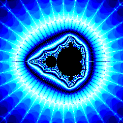 Hij is bijna gelijk aan de vorige, alleen heb je nu de mogelijkheid om rechtstreeks op de Mandelbrotverzameling in te zoomen. Onderzoek eens het gebied in de buurt van Re(c) = 0.25. Wanneer je dicht tegen de rand van de Mandelbrotverzameling aanzit, zul je soms het aantal iteraties flink moeten opvoeren, en dan kan het wel even duren, voor het plaatje af is.