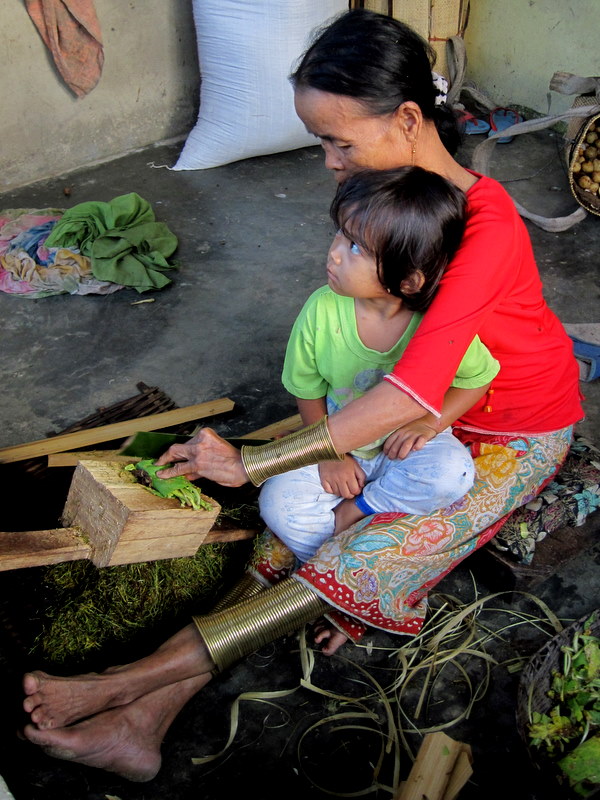 This one of the remaining ladies wearing brass coils. She is cutting the tobacco with a bamboo "knife"!