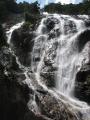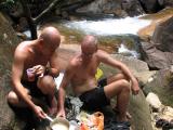 | During an earlier visit to Kelantan I had been looking in vain for Lata Berangin. At Lata Rek I met some locals who told me they could guide me there, but I had not enough time. Recently an acquaintance from Kota Baharu sent me more detailed directions how to reach this fall. Then there still was an 'unfinished' job in Terengganu, the Cemerong Fall, which I had seen from far away only. And another friend had told me about Lata Jarum, a waterfall near Raub in Pahang. Time for some serious waterfall hunting! So Paul, Karl and I left KL at CNY and, after breakfast in Bentong, found Lata Jarum without any problem. A nice cascade with lots of water. In the past there must have been attempts to 'develop' the fall, but it looked quite neglected now. After lunch in Kuala Lipis, the former capital of Pahang, we continued our trip to Gua Musang, where we took rooms in the Evergreen Hotel for RM 72. In the afternoon we visited the Pulai Swee Nyet temple in nearby Pulai. This is one of the oldest temples in Malaysia, rebuilt in 1970 after it had been destroyed during the Japanese occupation. On the other side of the river is a very interesting rock temple, still under construction. We observed a beautiful snake there. The next morning we first had a look at Lata Rek. Quite a big river with powerful cascades and a nice sandy beach. Finding Lata Berangin turned out to be easier than expected. No off-road driving, just a good, although narrow, tar road. But NO signage at all, so you have to know which road to take! Strange, because this is quite a spectacular waterfall. We tried to find a way to climb to the top, but gave up half-way. Local people told us, that several people have died here. With a feeling of "mission accomplished" we continued to the East Coast, where we could not resist the temptation to have a refreshing sea bath, before we went to K. Terengganu, where we took a room for only RM 55. We had dinner in Chinatown, where it was unexpectedly crowded. The next morning we first visited the famous Floating Mosque and then continued to Hutan Lipur Cemerong. When I visited Cemerong in 2004, the park was officially closed for renovation. Now new buildings had been constructed, although it did not look operational yet. A new over-sized bridge had been built across Sg Cemerong, and we decided to use this bridge and follow the trail on the right side of the stream, leading to Gunung Berembun. A strenuous climb followed. Two hours later and more than 400 meters higher, we could not hear the sound of the stream anymore. We decided to backtrack and, following a very steep trail, managed to scramble down to the river. There we saw that the waterfall was still above us. :-( We took some rest and prepared coffee, while Karl checked if it was possible to follow the stream. No way, big steep rocks everywhere. So what to do? Give up? Suddenly Paul saw two people on the other side of the stream, apparently following a trail! We crossed the stream, climbed up to this trail and followed it upstream. After about ten minutes, wow, there was the waterfall! A spectacular sight. Could be ~300 meter high. Lots of water. Might be the most beautiful waterfall in Peninsular Malaysia. Now our mission was really accomplished.. :-) Reluctantly we finally left this wonderful place. We will come back to explore the fall further. Probably the trail we took first, to Gunung Berembun, will eventually reach the top of the fall. This was a very successful trip. Malaysia Boleh! | ||||||||||||||||||||||||||||||||||||||||||||||||||||||||||||||||||||||||||||||||||||||||||||||||